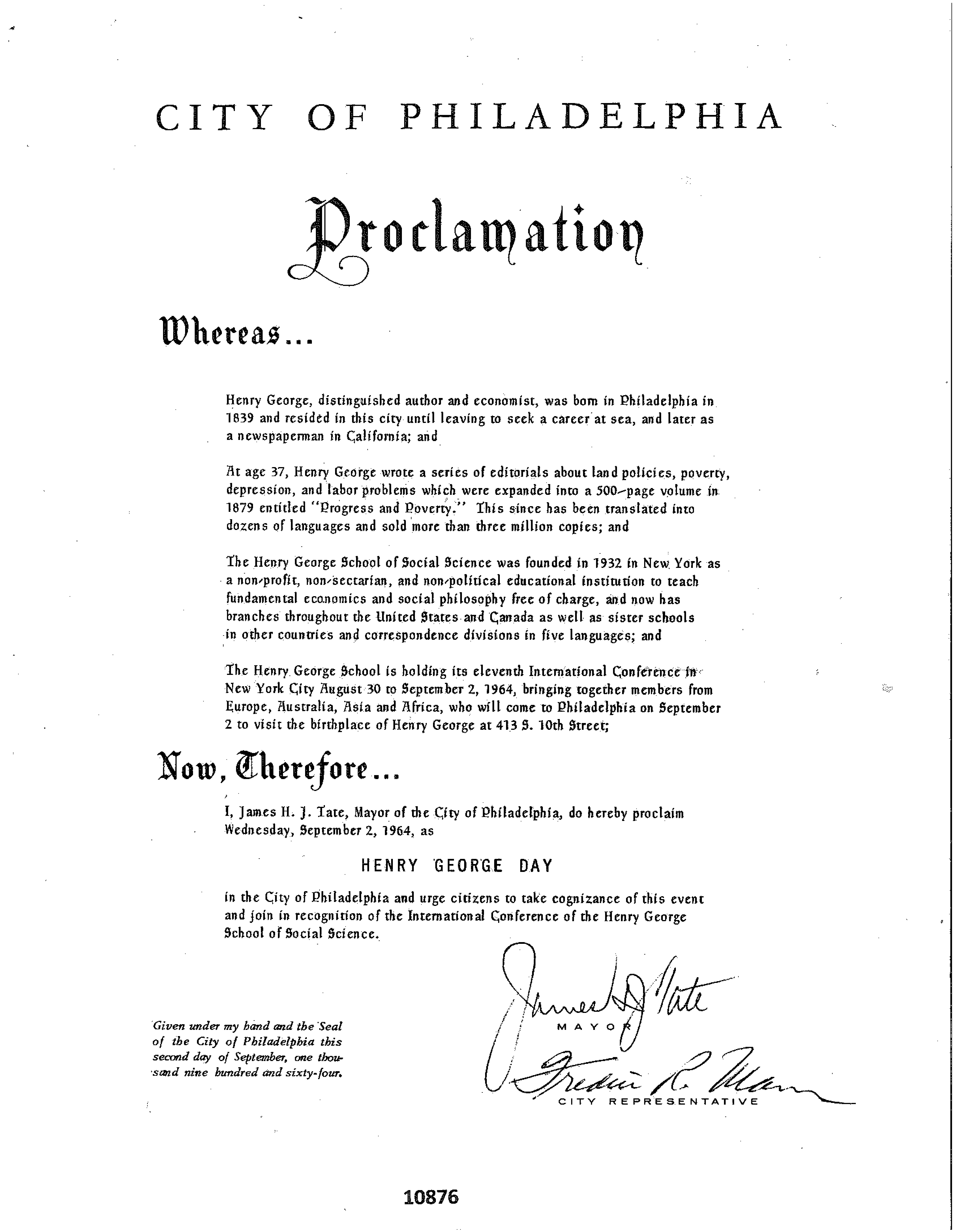 A new historical collection has just been added with material on Henry George and Progress and Poverty Anniversary Celebrations. Highlights from this collection include documents from the 100th anniversary celebration of Henry George’s birth in 1939 and the Centennial Celebration of Progress and Poverty in 1979. Additionally, Series Six of this collection includes copies of the Henry George Day Proclamations issued by city, state, and county leaders.
