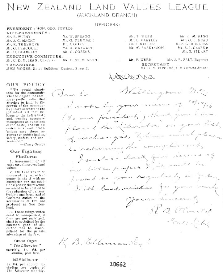 The National Single Tax League of New Zealand formed soon after the Georges’ visit. It later became known as the New Zealand Land Values League.