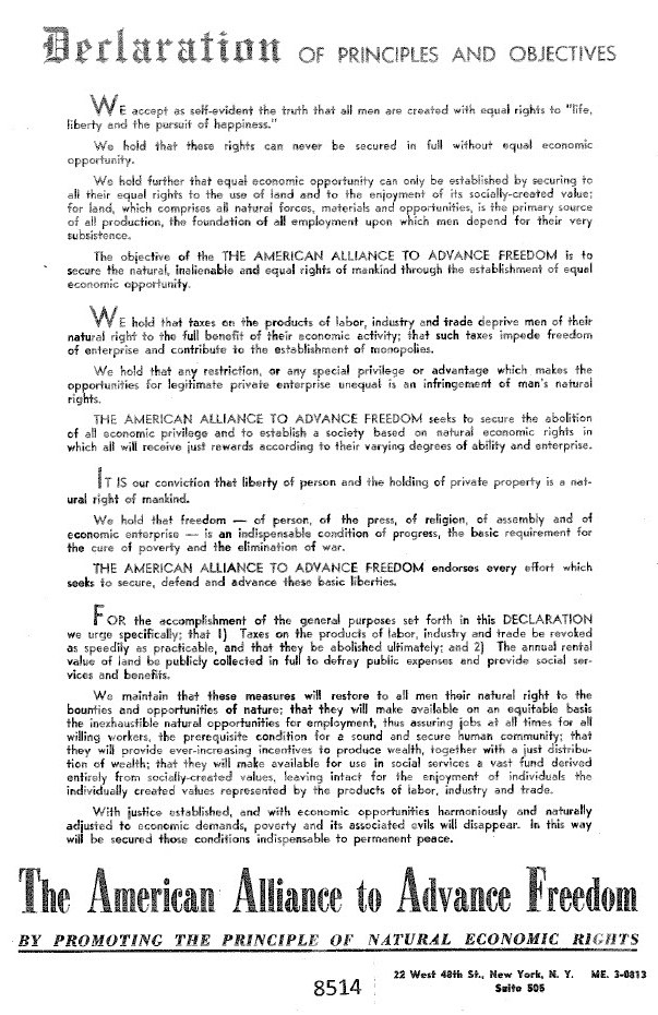 Followers of Henry George formed the American Alliance to Advance Freedom in 1941 to “awaken interest” among those unfamiliar with George’s doctrines and promote legislation based on the principles of the equal right to use the land and free trade. Sidney J. Abelson served as chairman.