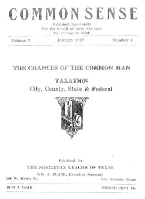 Formed March 16, 1916 at the first Single Tax Conference in Texas. Previously, the work of spreading the ideals of the single tax in Texas was conducted by the Texas League for the Taion of Land Values. William Black carried out much of the work of the Single Tax League of Texas, which included legislative campaigns designed to elect representatives sympathetic to single tax principles. In 1918, Black was made a member of the Joint Labor Legislative Board of Texas where he pushed for the adoption of a state constitutional amendment that would allow cities and counties to tax land values at higher rates than taxes on buildings and other improvements. The Single Tax League of Texas occasionally published a periodical titled Common Sense.