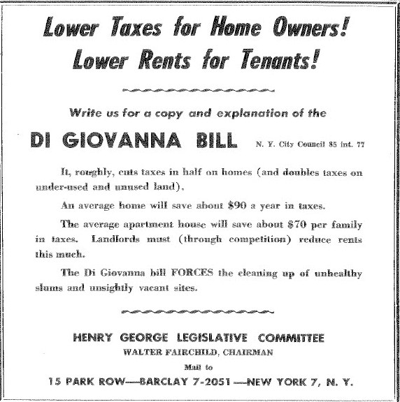 Chaired by Walter Fairchild, the Henry George Legislative Committee formed in 1941 to draft and support legislation based on single tax principles. The Committee worked with the American Association of Scientific Taxation and the Graded Tax Committee of New York. Walter Fairchild served as secretary.