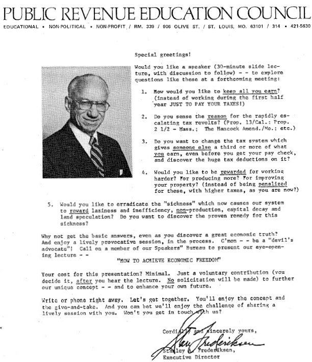 The Public Revenue Education Council (PREC) was established in the winter 1950-1951 during a series of meetings held in St. Louis by those concerned about the problems which arise from an improper source of public revenue. The PREC was incorporated as a non-profit educational institution by the State of Missouri on January 31, 1952.
