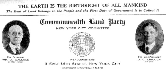 In 1924, the Commonwealth Land Party-USA nominated William J. Wallace of New Jersey for President and John C. Lincoln of Cleveland for Vice-President. In 1926 the CLP held an International Single Tax Conference in Denmark with delegates from Great Britain, Denmark, Germany, and France. James Bruce Lindsey of the CLP of Ohio, served as Conference Chairman.
