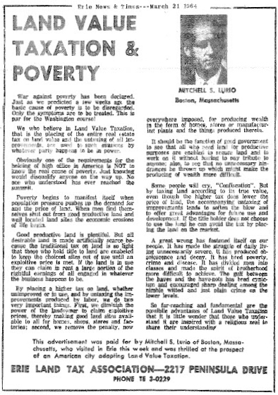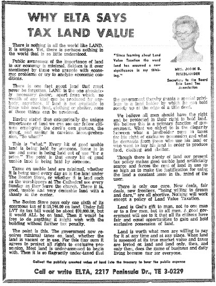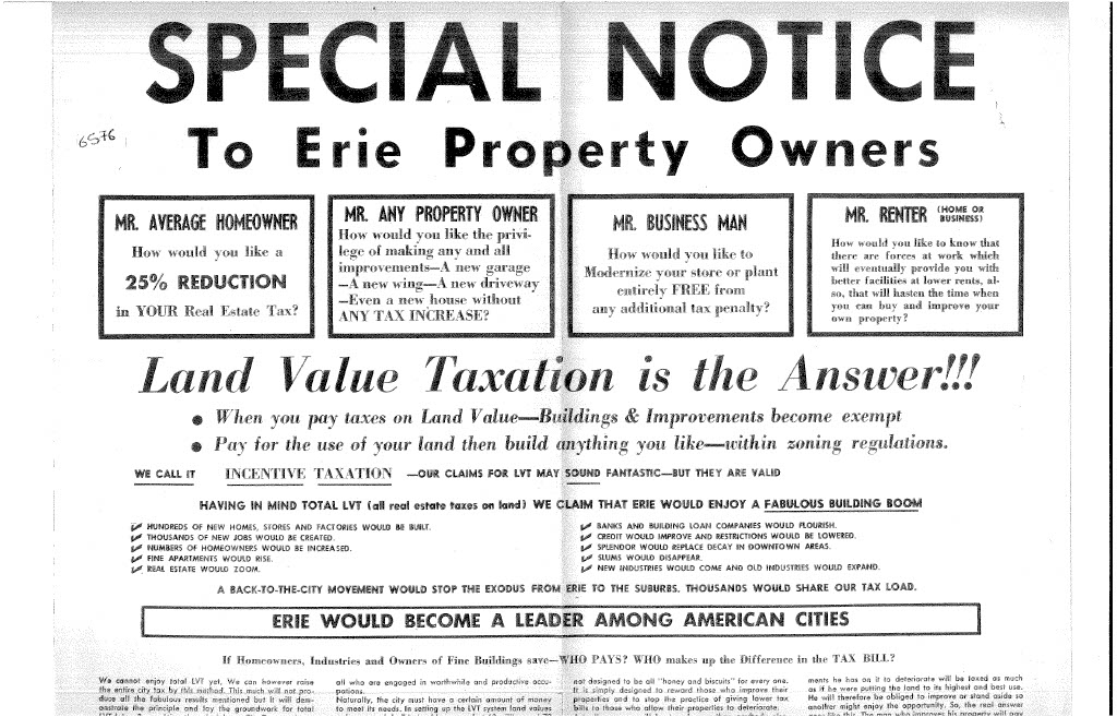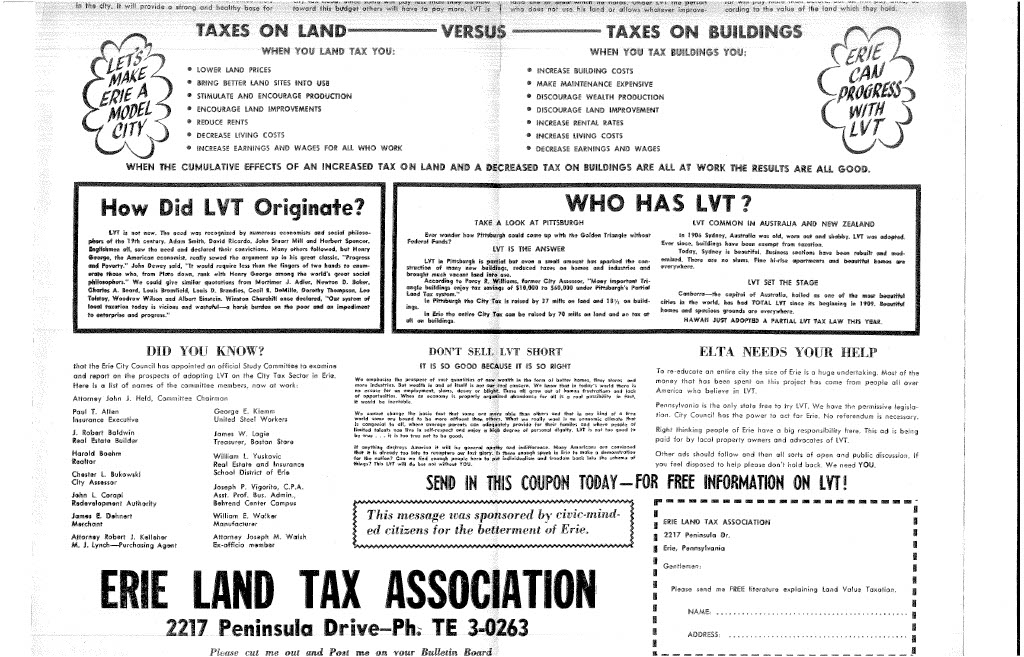The Erie Land Tax Association (ELTA) was organized in the early 1960s to educate the citizens of Eire on the many advantages of land value taxation. In April 1963, the Erie City Council appointed a Special Study Committee to investigate the merits of adopting a graded system of property taxation. The Committee then formed a pro and con subcommittee. The findings of the pro and con subcommittees were presented in a report to the City Council later that year and published by the ELTA. This report is included in Series Four.