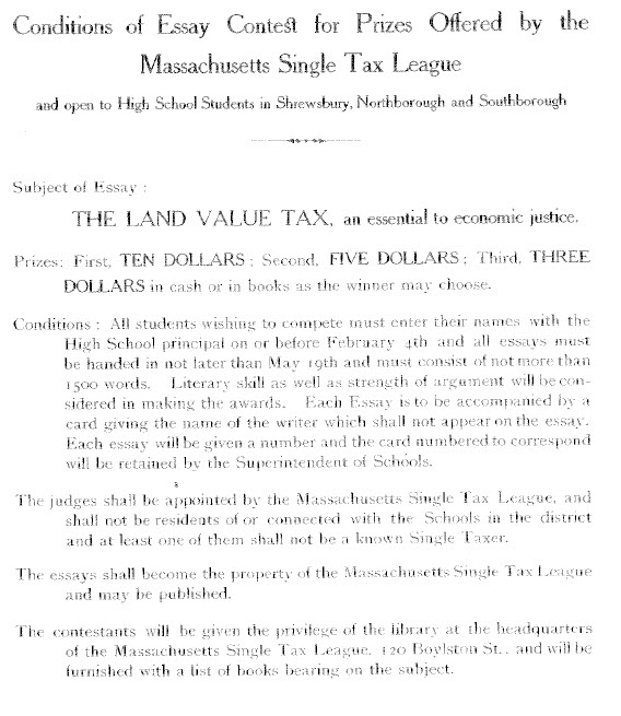 The Massachusetts Single Tax League sprung from the Anti-Poverty Society of Boston in 1890. In its early years, the League served as a local outgrowth of the National Single Tax League by helping spread the single tax gospel through public meetings, dinners, and banquets. For several years, League members held an open-air meeting every Sunday on the Boston Common. Later, the League established a correspondence committee responsible for sending single tax literature to area schools, colleges, and universities. Occasionally, the League sponsored essay contests local high schools.