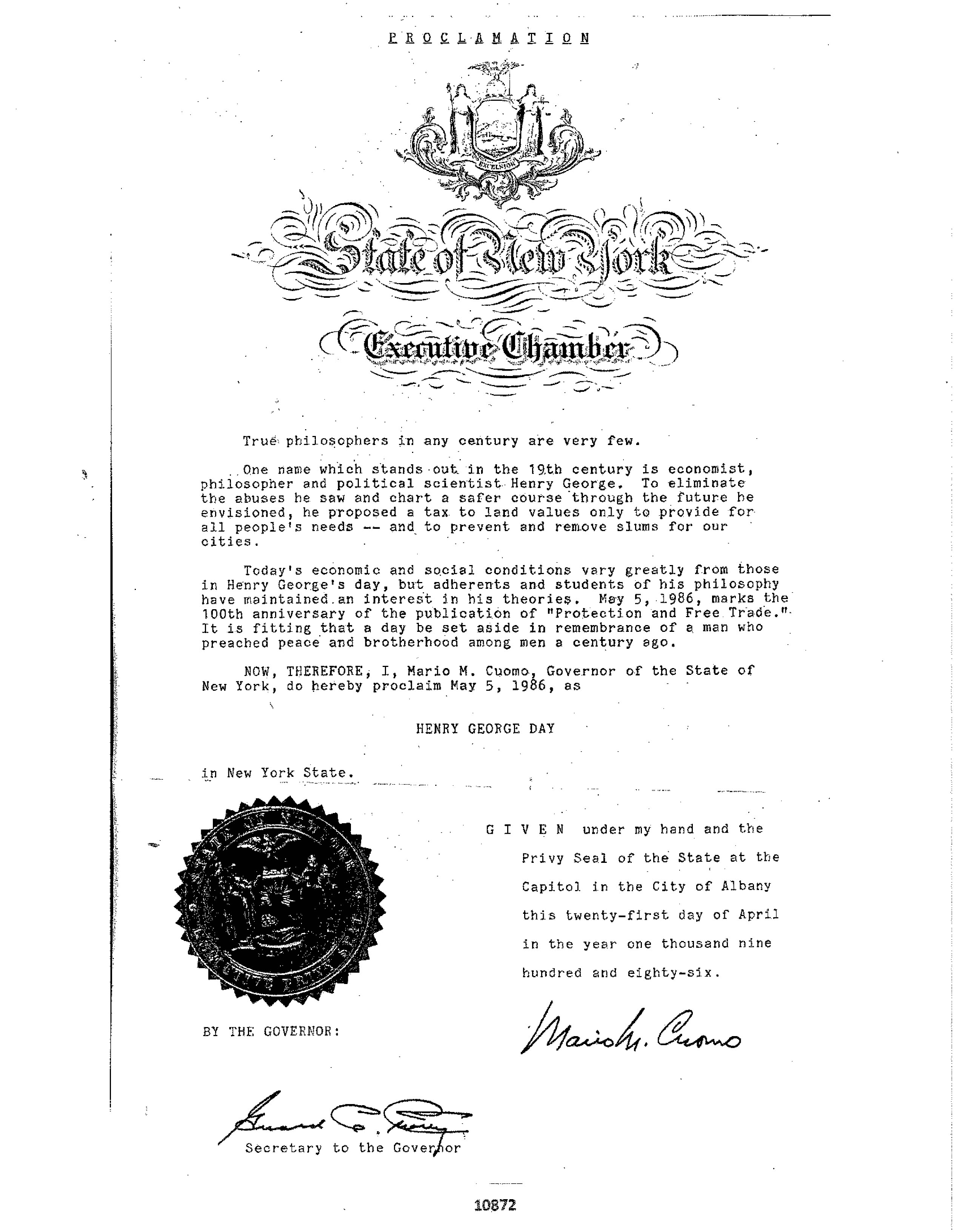 State of New York Henry George Day Proclamation, May 5, 1986_1