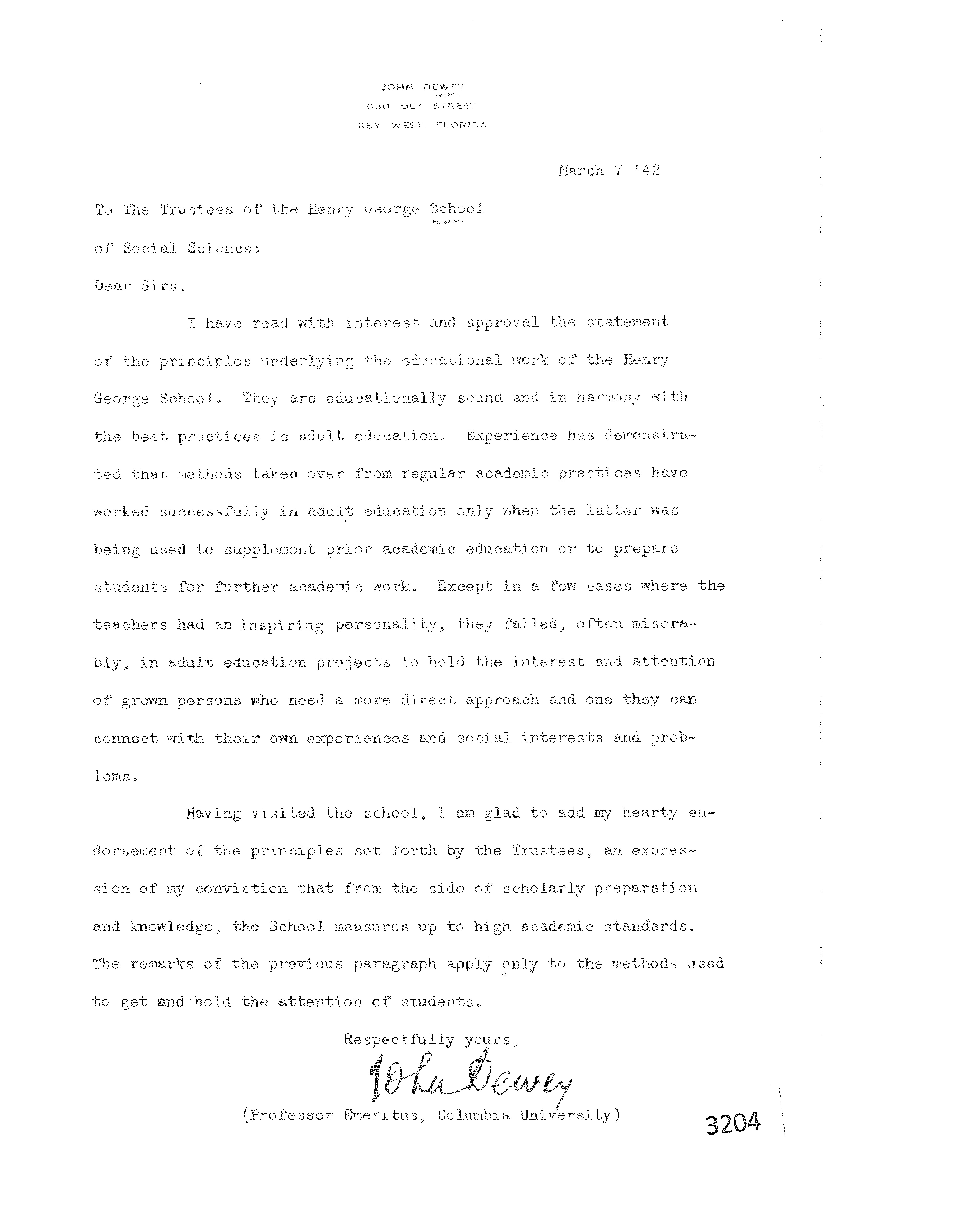Dewey’s deep appreciation of Henry George likely influenced his decision to endorse the educational program of Henry George School of Social Science, for which he was named honorary president in 1938. After visiting the School in the early 1940s, Dewey penned the following letter: